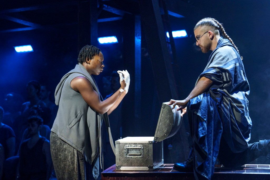 Reimagined for the 2016 run at Regents Park Open Air Theatre, this production has all the style of a modern take to capture a new generation of audiences. Stylish costumes and symbolic use of glitter for violent scenes redefine the dramatic moments of the show, enhancing the impact of those scenes. In Judas’ (Shem Omari James) exchange of information on Jesus (McIntosh) to the Pharisees for silver, paint is used to coat Judas’ hands, symbolising not only his reward but his un-washable consuming guilt too which was so effective as the paint remained throughout act 2.